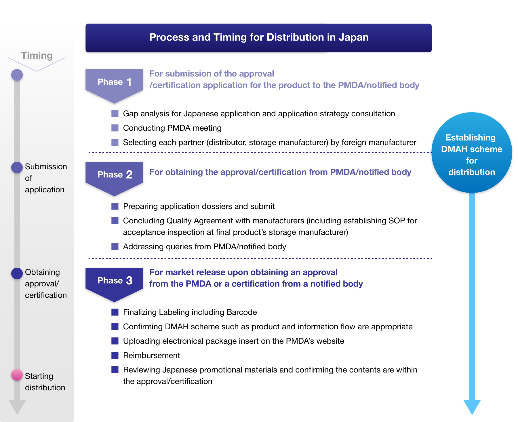 To appreciate the comprehensiveness and advantage of Cobridge compared to the multitude of DMAH-specializing firms, a time course of the involvement of the DMAH in the regulatory pathway to market is illustrative. The approval application must be submitted by a DMAH to the Pharmaceuticals and Medical Devices Agency (PMDA) for review and approval. Cobridge thus represents the applicant from the time of application and takes care of the application until approval, including acting as the PMDA correspondent. Thus Cobridge can cover all of the required regulatory activities associated with obtaining marketing approval for a medical product, from gap-analysis and preparation of the approval dossier (see the associated pages on this website), through shepherding the application through the review and approval process by the PMDA to performing the regulatory-compliance maintenance activities as the ongoing DMAH for the approved product.