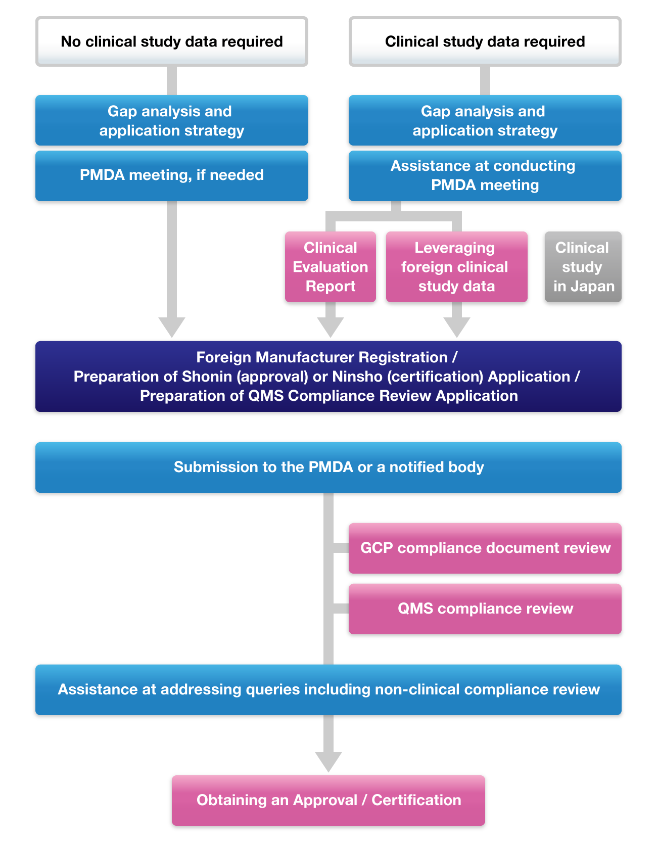 We understand the transition of dossiers for products brought to market first overseas and then to Japan, and have experience in the preparation of Japanese registration documents from North American and European dossiers. We examine a product’s existing preclinical and clinical data to design a regulatory strategy for the best path to Japanese MHLW or PMDA approval or certification from third party certification body.