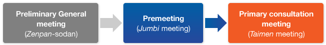- preliminary general meeting (Zenpan sodan) to obtain confirmation and a guide for the subsequent meeting suitable for the issues