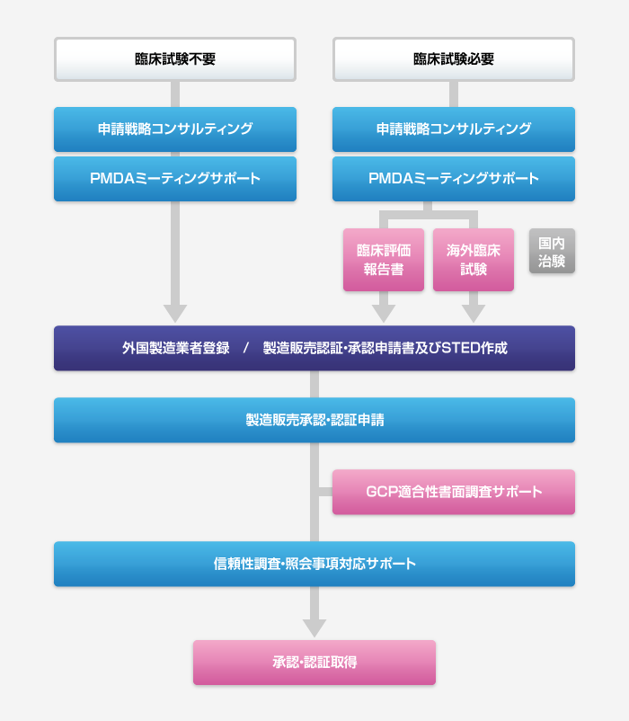 申請の目的や臨床試験の有無に応じてフレキシブルなサービスフローをご用意し、各種業務をスムーズ且つ強力にサポートいたします。